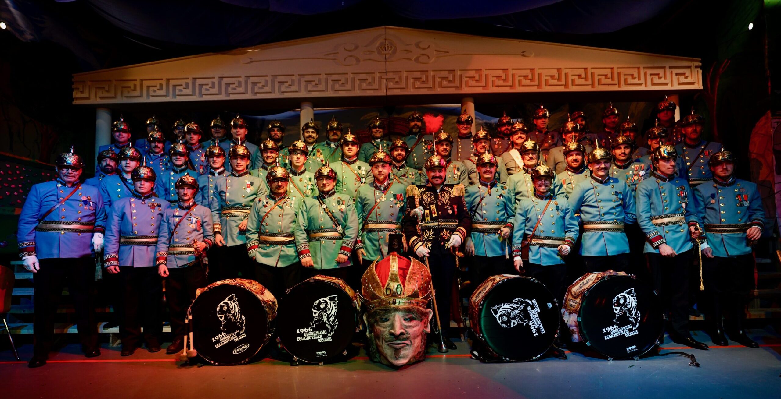 Eine handvoll junge Weggiser „Unterdörfler“ machten sich daran, die Weggiser Fasnacht musikalisch zu beleben. Am 8. Oktober 1966 war es dann soweit. Sie versammelten sich im Nauenhüttli und besiegelten den Entschluss bei einer Kiste Bier. Unser erster Fernsehauftritt erlebten wir am Umzug 1976 in Bellinzona. Schon bald organisierten wir unseren ersten Maskenball – den Egliball, jedoch noch mit mässigem Erfolg